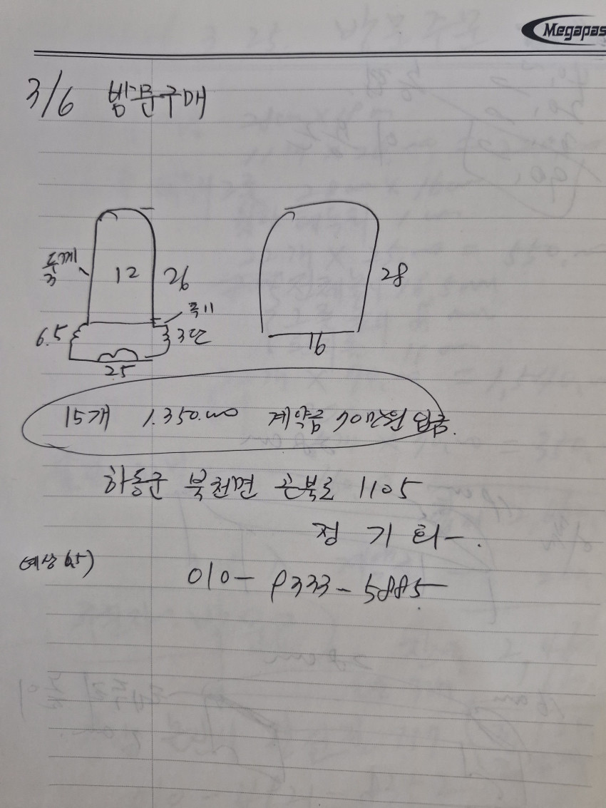 2026년 3월 6일 하동 정기화 지방 주문제작. 주문확인 0 165 0 2026-04-16 09:56:57 주문 제작 의뢰 날짜: 방문일 2026년 3월 6일 주문 제품: 지방 본체 및 뚜껑 15 세트 주문자 이름: 정기화 연락처: 010-9333-5885 주소: 경남 하동군 곤북로 1105 0